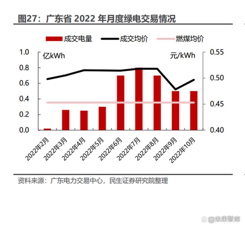 2022 年推動(dòng)綠電交易的相關(guān)政策持續(xù)加碼,有望進(jìn)一步擴(kuò)大綠電交易需求。 2022 年 1 月,國家發(fā)改委、國家能源局聯(lián)合發(fā)布《關(guān)于加快建設(shè)全國統(tǒng) 一電力市場體系的指導(dǎo)意見》(發(fā)改體改〔2022〕118 號(hào)),《意見》將“探索開展綠色電力交易”單列于“構(gòu)建適應(yīng)新型電力系統(tǒng)的市場機(jī)制”項(xiàng)下, 指出應(yīng)引導(dǎo)有需求的用戶直接購買綠色電力,做好綠色電力交易與綠證 交易、碳排放權(quán)交易的有效銜接。 2022 年 1 月,國家發(fā)改委等 7 部委聯(lián)合發(fā)布《促進(jìn)綠色消費(fèi)實(shí)施方案》 (發(fā)改就業(yè)〔2022〕107 號(hào)),《方案》指出,要引導(dǎo)用戶簽訂綠色電力 交易合同,并在中長期交易合同中單列,加強(qiáng)高耗能企業(yè)使用綠色電力的 剛性約束,且明確提出了建立綠色電力交易與可再生能源消納責(zé)任權(quán)重 掛鉤機(jī)制。 2022 年 1 月、5 月,廣州電力交易中心、北京電力交易中心相繼印發(fā)《南 方區(qū)域綠色電力交易規(guī)則(試行)》(廣州交易〔2022〕15 號(hào))、《北京電 力交易中心綠色電力交易實(shí)施細(xì)則》(京電交市〔2022〕24 號(hào))!兑(guī)則》 強(qiáng)調(diào),綠色電力交易主要包括省內(nèi)綠色電力交易和省間綠色電力交易;價(jià) 格方面,綠色電力交易價(jià)格由市場主體通過雙邊協(xié)商、掛牌交易等方式形 成;綠色電力交易價(jià)格應(yīng)充分體現(xiàn)綠色電力的電能價(jià)值和環(huán)境價(jià)值,原則 上市場主體應(yīng)分別明確電能量價(jià)格與綠色環(huán)境權(quán)益價(jià)格。