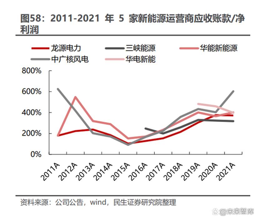 對比各年度期末應(yīng)收賬款余額和全年凈利潤、營業(yè)收入、經(jīng)營凈現(xiàn)金流以及期末凈資產(chǎn),可以發(fā)現(xiàn)應(yīng)收賬款對企業(yè)經(jīng)營造成了影響。同樣以這 6 家公司為例: 期末應(yīng)收賬款/當(dāng)年凈利潤:6 家公司在 2021 年度的比值均在 300%以 上,最高的是大唐新能源,達(dá)到了 9 倍;2016-2021 年均值均超過 250%, 大唐新能源接近 9.5 倍。 期末應(yīng)收賬款/當(dāng)年?duì)I業(yè)收入:除龍?jiān)措娏ν猓渌?/span> 5 家公司在 2021 年 度的比值均在 100%以上,即期末應(yīng)收賬款大于全年?duì)I業(yè)收入;而 2016- 2021 年均值也都接近 100%上下。龍?jiān)措娏Φ谋戎递^低,主要是因?yàn)槠?/span> 有一定體量的裝機(jī)是火電,營收中沒有補(bǔ)貼部分。 期末應(yīng)收賬款/當(dāng)年經(jīng)營凈現(xiàn)金流:6 家公司在 2021 年度的比值在 150% 以上,除龍?jiān)措娏ν,其?/span> 5 家甚至在 200%以上;2016-2021 年均值 基本在 1 倍以上,華電新能甚至超過 2 倍。 期末應(yīng)收賬款/期末凈資產(chǎn):6 家公司在 2021 年度的比值在 25%以上, 華能新能源、大唐新能源、華電新能超過 50%;2016-2020 年均值在 20% 以上。