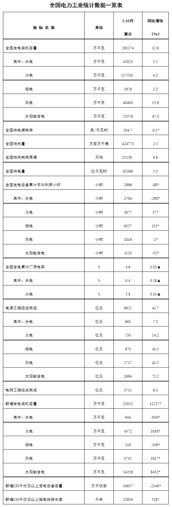 11月20日,國家能源局發(fā)布1-10月份全國電力工業(yè)統(tǒng)計數(shù)據(jù)。