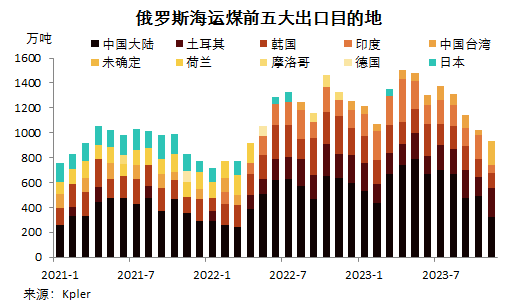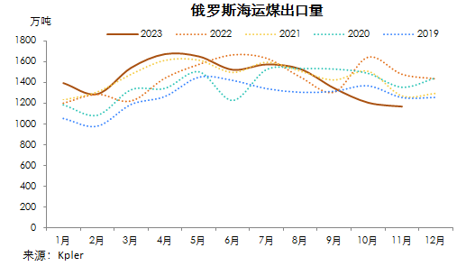 Kpler船舶追蹤數(shù)據(jù)顯示,2023年11月份,俄羅斯海運(yùn)煤出口量1168.73萬(wàn)噸,環(huán)比降3.10%,連續(xù)第四月環(huán)比下降,同比降21.02%。