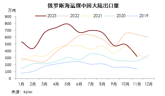1-11月份,俄羅斯累計(jì)出口海運(yùn)煤1.59億噸,較去年同期減少0.08%。其中向中國(guó)大陸出口6492.55萬(wàn)噸,同比增23.37%;占比41%。