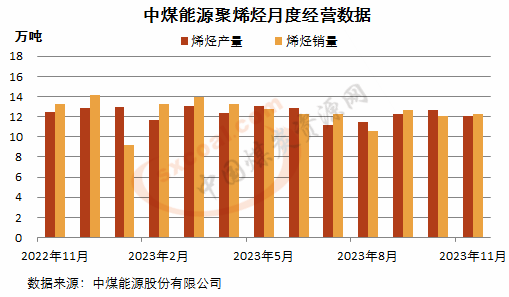 11月份,中煤能源聚乙烯產(chǎn)量6.3萬噸,同比下降1.6%,環(huán)比下降3.1%;銷量5.8萬噸,同比減少18.3%,環(huán)比下降13.4%。聚丙烯產(chǎn)量5.8萬噸,同比下降4.9%,環(huán)比下降6.5%;銷量6.5萬噸,同環(huán)比分別增長4.8%和20.4%。