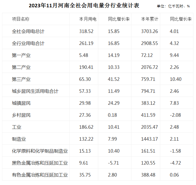 國家能源局河南監(jiān)管辦公室12月19日發(fā)布數(shù)據(jù)顯示,2023年11月,河南省全省全社會用電量318.52億千瓦時,同比增加15.85%;1-11月累計用電量3703.26億千瓦時,同比增加4.01%。
