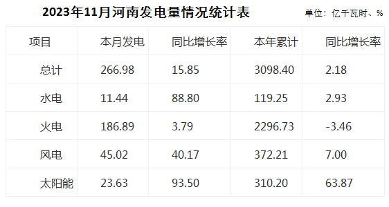 發(fā)電量方面,11月份全省發(fā)電量266.98億千瓦時,同比增加15.85%;1-11月累計發(fā)電量3098.40億千瓦時,同比增加2.18%。