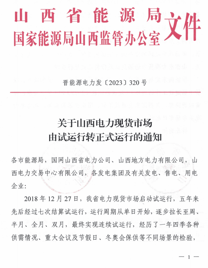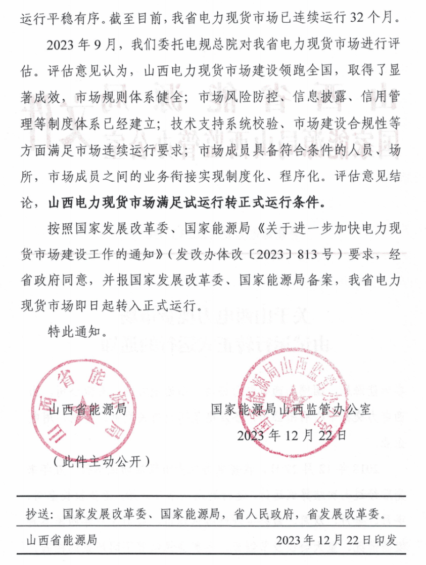 近日,山西省能源局、山西能監(jiān)辦發(fā)布《關(guān)于山西電力現(xiàn)貨市場(chǎng)由試運(yùn)行轉(zhuǎn)正式運(yùn)行的通知》(晉能源電力發(fā)[2023] 320號(hào)).通知稱,經(jīng)報(bào)請(qǐng)山西省政府同意,并報(bào)國(guó)家發(fā)展改革委、國(guó)家能源局備案同意,山西電力現(xiàn)貨市場(chǎng)自2023年12月22日起轉(zhuǎn)入正式運(yùn)行。標(biāo)志著山西省電力現(xiàn)貨市場(chǎng)由試運(yùn)行轉(zhuǎn)入正式運(yùn)行,成為我國(guó)第一個(gè)正式運(yùn)行的電力現(xiàn)貨市場(chǎng)。