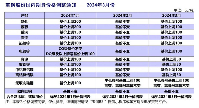 經(jīng)研究決定,寶鋼股份板材內(nèi)銷價格2024年3月份在2024年2月份基礎(chǔ)上調(diào)整公告如下(以下除特殊注明外,均為不含稅):