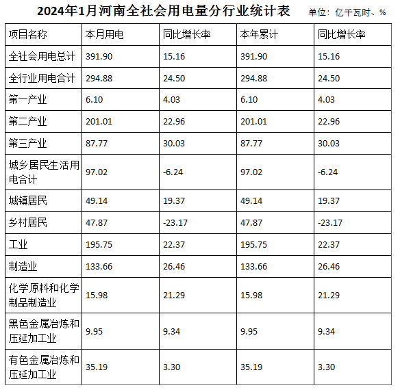 國家能源局河南監(jiān)管辦公室3月15日發(fā)布數(shù)據(jù)顯示,2024年1月,河南省全省全社會(huì)用電量391.90億千瓦時(shí),同比增加15.16%。
