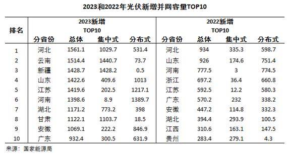 另外,去年位于新增第十四和第十八的云南、新疆一躍成為2023年的“榜眼”和“探花”。從細(xì)分?jǐn)?shù)據(jù)可以看出,云南、新疆上榜的原因主要出于集中式光伏電站的大規(guī)模并網(wǎng),這得益于國(guó)家對(duì)大基地建設(shè)的政策推行。