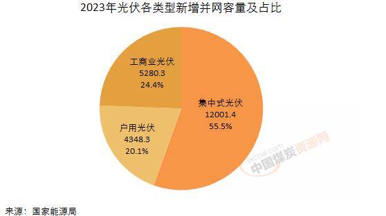 分結(jié)構(gòu)來看,集中式光伏電站12001.4萬(wàn)千瓦,同比大增230.7%。分布式光伏9628.6萬(wàn)千瓦,同比增長(zhǎng)88.4%。而分布式光伏中戶用光伏達(dá)到4348.3萬(wàn)千瓦,同比增長(zhǎng)72.2%。2023年因大基地建設(shè)的推進(jìn),集中式光伏電站新增得到大幅提升,反超分布式,占比55.5%。在新增分布式光伏中,工商業(yè)分布式新增5280.3萬(wàn)千瓦,占比24.4%,戶用布式則為4348.3萬(wàn)千瓦,占比20.1%。