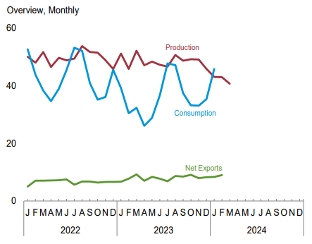 消費(fèi)方面,報(bào)告顯示,2024年1月份,美國(guó)煤炭總消費(fèi)量為4566.7萬(wàn)短噸,同比增加16.9%,環(huán)比增長(zhǎng)25.9%。