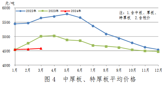 3月份,中厚板產(chǎn)量532萬(wàn)噸,同比增加1萬(wàn)噸,上升0.1%;銷(xiāo)售537萬(wàn)噸,其中出口36萬(wàn)噸,產(chǎn)銷(xiāo)率101.0%;售價(jià)4540元/噸,比上月上漲21元/噸。累計(jì)產(chǎn)量1545萬(wàn)噸,同比增加36萬(wàn)噸,上升2.4%。中厚板、特厚板平均價(jià)格見(jiàn)圖4。