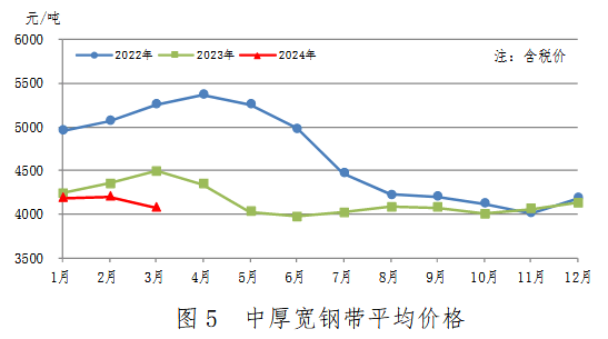 3月份,中厚寬鋼帶產(chǎn)量716萬(wàn)噸,同比減少12萬(wàn)噸,下降1.6%;銷(xiāo)售715萬(wàn)噸,其中出口52萬(wàn)噸,產(chǎn)銷(xiāo)率99.9%;售價(jià)4070元/噸,比上月下跌130元/噸。累計(jì)產(chǎn)量1982萬(wàn)噸,同比減少62萬(wàn)噸,下降3.0%。中厚寬鋼帶平均價(jià)格見(jiàn)圖5。