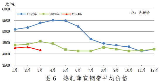 3月份,熱軋薄寬鋼帶產(chǎn)量256萬(wàn)噸,同比增加26萬(wàn)噸,上升11.5%;銷(xiāo)售257萬(wàn)噸,其中出口28萬(wàn)噸,產(chǎn)銷(xiāo)率100.1%;售價(jià)4169元/噸,比上月下跌137元/噸。累計(jì)產(chǎn)量728萬(wàn)噸,同比增加53萬(wàn)噸,上升7.8%。熱軋薄寬鋼帶均價(jià)見(jiàn)圖6。