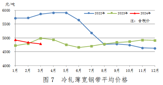 3月份,冷軋薄寬鋼帶產(chǎn)量382萬(wàn)噸,同比增加47萬(wàn)噸,上升14.0%;銷(xiāo)售379萬(wàn)噸,其中出口17萬(wàn)噸,產(chǎn)銷(xiāo)率99.2%;售價(jià)4790元/噸,比上月下跌50元/噸。累計(jì)產(chǎn)量1090萬(wàn)噸,同比增加106萬(wàn)噸,上升10.8%。冷軋薄寬鋼帶平均價(jià)格見(jiàn)圖7。