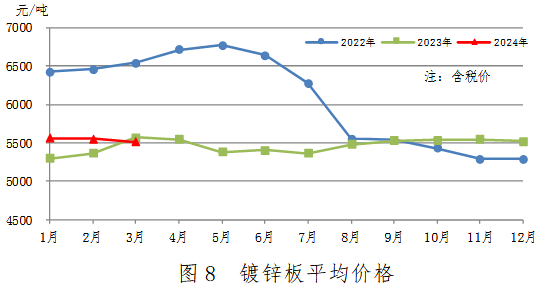 3月份,鍍鋅板產(chǎn)量238萬(wàn)噸,同比增加32萬(wàn)噸,上升15.3%;銷(xiāo)售242萬(wàn)噸,其中出口23萬(wàn)噸,產(chǎn)銷(xiāo)率101.9%;售價(jià)5515元/噸,比上月下跌38元/噸。累計(jì)產(chǎn)量675萬(wàn)噸,同比增加62萬(wàn)噸,上升10.2%。鍍鋅板平均價(jià)格見(jiàn)圖8。