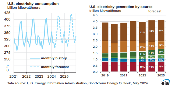 美國(guó)能源信息署(EIA)5月7日發(fā)布的最新《短期能源展望》報(bào)告顯示,2024年,美國(guó)電力需求預(yù)計(jì)將同比增加2.58%,至41030億千瓦時(shí),高于前一月預(yù)期值40960億千瓦時(shí)。