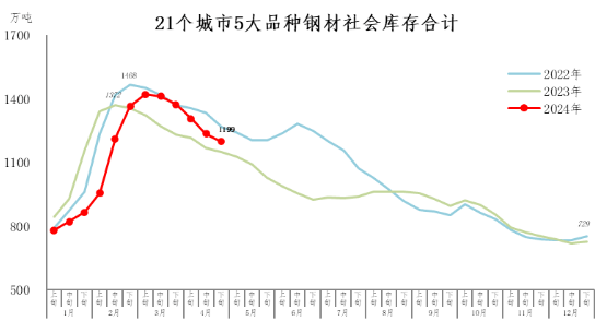 4月下旬,21個(gè)城市5大品種鋼材社會(huì)庫(kù)存1199萬(wàn)噸,環(huán)比減少38萬(wàn)噸,下降3.1%,庫(kù)存連續(xù)下降,降幅收窄;比3月下旬減少175萬(wàn)噸,下降12.7%;比年初增加470萬(wàn)噸,上升64.5%;比上年同期增加48萬(wàn)噸,上升4.2%。