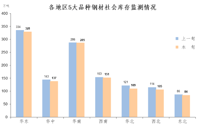 4月下旬,分地區(qū)來(lái)看,七大區(qū)域庫(kù)存環(huán)比均有不同程度下降,具體情況為:華北庫(kù)存環(huán)比減少12萬(wàn)噸,下降9.9%,為減量和降幅最大地區(qū);華南減少1萬(wàn)噸,下降0.3%;西南減少2萬(wàn)噸,下降1.3%;西北減少9萬(wàn)噸,下降7.9%;華中減少6萬(wàn)噸,下降4.2%;華東減少6萬(wàn)噸,下降1.8%;東北減少2萬(wàn)噸,下降2.3%。