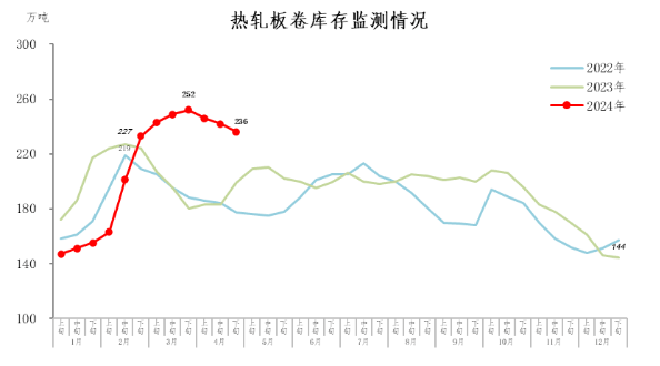 4月下旬,熱軋板卷庫(kù)存236萬(wàn)噸,環(huán)比減少6萬(wàn)噸,下降2.5%;比3月下旬減少16萬(wàn)噸,下降6.3%;比年初增加92萬(wàn)噸,上升63.9%;比上年同期增加37萬(wàn)噸,上升18.6%。