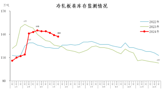 4月下旬,冷軋板卷庫(kù)存137萬(wàn)噸,環(huán)比減少2萬(wàn)噸,下降1.4%,庫(kù)存連續(xù)小幅下降;比3月下旬減少7萬(wàn)噸,下降4.9%;比年初增加34萬(wàn)噸,上升33.0%;比上年同期增加12萬(wàn)噸,上升9.6%。