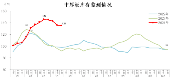 4月下旬,中厚板庫(kù)存135萬(wàn)噸,環(huán)比減少1萬(wàn)噸,下降40.7%,庫(kù)存降幅收窄;比3月下旬減少10萬(wàn)噸,下降6.9%;比年初增加41萬(wàn)噸,上升43.6%;比上年同期增加43萬(wàn)噸,上升46.7%。