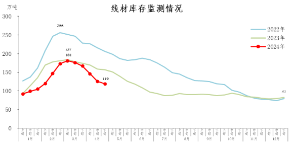 4月下旬,線材庫(kù)存119萬(wàn)噸,環(huán)比減少7萬(wàn)噸,下降5.6%,庫(kù)存連續(xù)下降,降幅有所收窄;比3月下旬減少48萬(wàn)噸,下降28.7%;比年初增加36萬(wàn)噸,上升43.4%;比上年同期減少38萬(wàn)噸,下降24.2%。