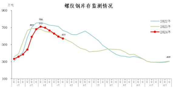 4月下旬,螺紋鋼庫(kù)存572萬(wàn)噸,環(huán)比減少22萬(wàn)噸,下降3.7%,庫(kù)存繼續(xù)下降;比3月下旬減少94萬(wàn)噸,下降14.1%;比年初增加267萬(wàn)噸,上升87.5%;比上年同期減少6萬(wàn)噸,下降1.0%。