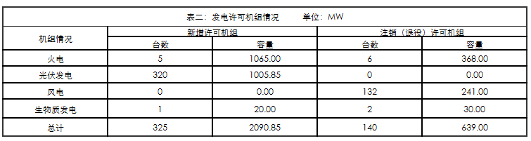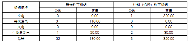 4月份,全省辦理電力業(yè)務許可證(發(fā)電類)共計48件,其中新申請3件,許可事項變更3件,登記事項變更42件。新增許可機組32臺(發(fā)電單元)總容量130MW,其中光伏發(fā)電110MW,生物質發(fā)電20MW;注銷(退役)許可機組總容量350MW,其中火電320MW,生物質發(fā)電30MW。