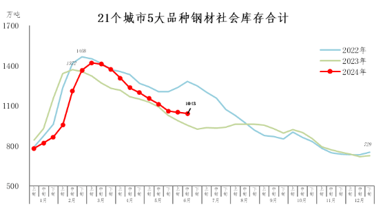 6月中旬,21個(gè)城市5大品種鋼材社會庫存1043萬噸,環(huán)比減少10萬噸,下降0.9%,庫存繼續(xù)小幅下降;比年初增加314萬噸,上升43.1%;比上年同期增加87萬噸,上升9.1%。