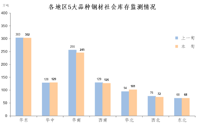 6月中旬,分地區(qū)來看,七大區(qū)域庫存環(huán)比多數(shù)下降,具體情況為:華南庫存環(huán)比減少10萬噸,下降3.9%,為減量最大地區(qū);西北減少4萬噸,下降5.3%,為降幅最大地區(qū);西南減少3萬噸,下降2.3%;華東減少1萬噸,下降0.3%;華北增加7萬噸,上升7.4%;華中增加1萬噸,上升0.8%;東北環(huán)比持平。