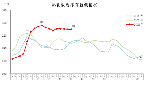 6月中旬,熱軋板卷庫存240萬噸,環(huán)比持平,庫存維持高位;比年初增加96萬噸,上升66.7%;比上年同期增加45萬噸,上升23.1%。