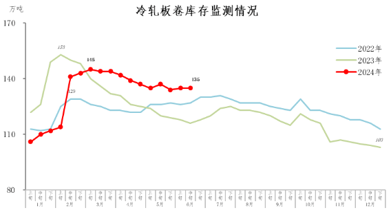 6月中旬,冷軋板卷庫存135萬噸,環(huán)比持平,庫存小幅波動(dòng);比年初增加32萬噸,上升31.1%;比上年同期增加19萬噸,上升16.4%。