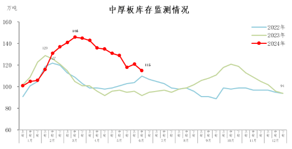 6月中旬,中厚板庫存115萬噸,環(huán)比減少6萬噸,下降45.0%,庫存由升轉(zhuǎn)降;比年初增加21萬噸,上升22.3%;比上年同期增加23萬噸,上升25.0%。