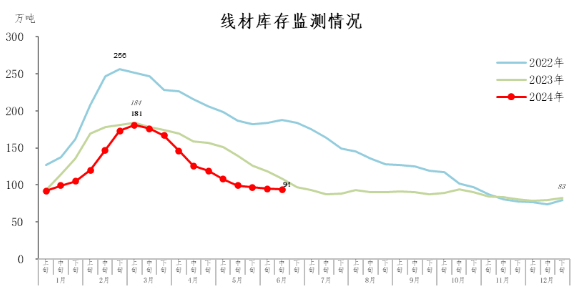 6月中旬,線材庫存94萬噸,環(huán)比減少1萬噸,下降1.1%,庫存繼續(xù)下降,降幅收窄;比年初增加11萬噸,上升13.3%;比上年同期減少15萬噸,下降13.8%。