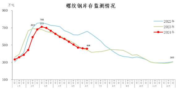 6月中旬,螺紋鋼庫存459萬噸,環(huán)比減少3萬噸,下降0.6%,庫存略有下降;比年初增加154萬噸,上升50.5%;比上年同期增加15萬噸,上升3.4%。