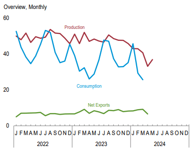 消費(fèi)方面,報告顯示,2024年3月份,美國煤炭總消費(fèi)量為2562.2萬短噸,同比下降20.56%,環(huán)比下降12.5%。