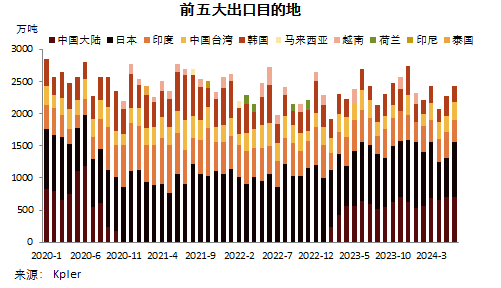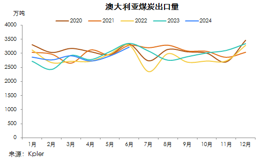 Kpler船舶追蹤數(shù)據(jù)顯示,2024年6月份,澳大利亞煤炭出口量3221.60萬(wàn)噸,環(huán)比增10.90%,為連續(xù)第二個(gè)月環(huán)比增長(zhǎng),但同比降3.93%。