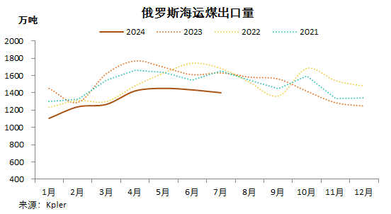 2024年1-7月份,俄羅斯海運煤出口量累計9320.57萬噸,同比降15.79%。今年以來,制裁、鐵路運力低以及物流成本高等因素制約著俄羅斯煤炭的出口。