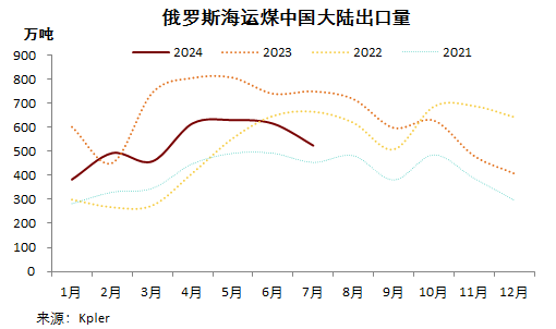 分目的地看,7月份俄羅斯向中國大陸出口海運煤523.85萬噸,環(huán)比降14.84%,同比降30.07%,占俄羅斯出口總量的37%。