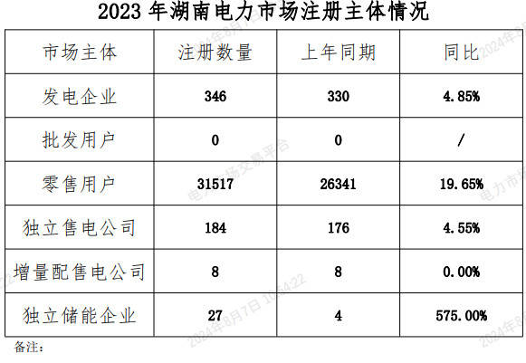 湖南電力交易中心發(fā)布了2023年湖南電力市場注冊主體情況,2023年發(fā)電企業(yè)注冊356家,同比增長4.85%;獨立售電公司注冊184家,同比增長4.55%;增量配售電公司注冊8家;零售用戶注冊31517家,同比增長19.45%;獨立儲能企業(yè)注冊27家,同比增幅最大,達到575.00%。