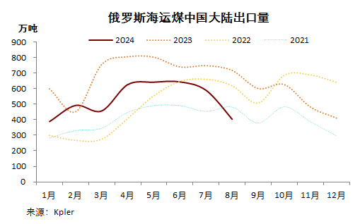 Kpler船舶追蹤數(shù)據(jù)顯示,2024年8月份,俄羅斯海運(yùn)煤出口量1214.92萬噸,環(huán)比降17.25%,環(huán)比連續(xù)第二月下降,同比降23.32%。