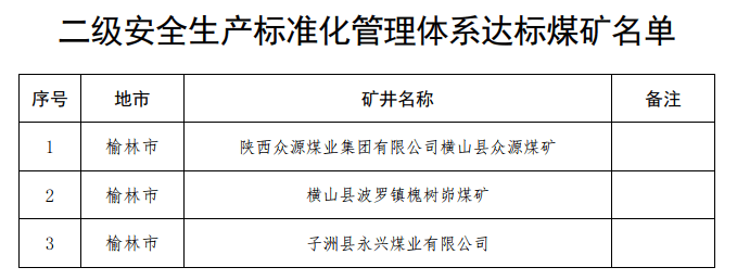 按照《煤礦安全生產(chǎn)標準化管理體系考核定級辦法》及《陜西省煤礦安全生產(chǎn)標準化管理體系考核定級實施細則(試行)》(陜應急〔2020〕140號)規(guī)定,經(jīng)資料審查、現(xiàn)場檢查、網(wǎng)上公示,現(xiàn)對達到二級安全生產(chǎn)標準化管理體系的3處煤礦(名單見附件)予以公告,自公告之日起有效期3年,在有效期內(nèi)享受《關于大力推進煤礦安全生產(chǎn)標準化建設工作的通知》(安監(jiān)總煤行〔2017〕59號)有關激勵政策。