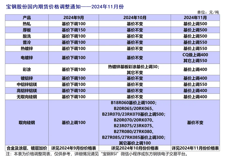 經(jīng)研究決定,寶鋼股份板材內(nèi)銷(xiāo)價(jià)格2024年11月份在2024年10月份基礎(chǔ)上調(diào)整公告如下(以下除特殊注明外,均為不含稅):