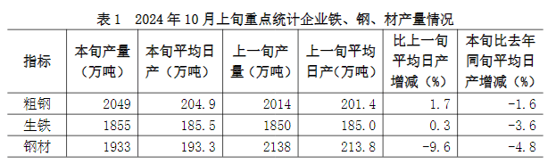 2024年10月上旬,重點(diǎn)統(tǒng)計(jì)鋼鐵企業(yè)共生產(chǎn)粗鋼2049萬噸,平均日產(chǎn)204.9萬噸,日產(chǎn)環(huán)比增長(zhǎng)1.7%;生鐵1855萬噸,平均日產(chǎn)185.5萬噸,日產(chǎn)環(huán)比增長(zhǎng)0.3%;鋼材1933萬噸,平均日產(chǎn)193.3萬噸,日產(chǎn)環(huán)比下降9.6%1(見表1)。