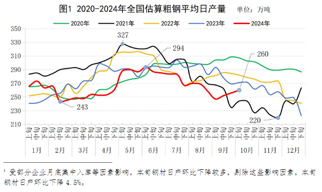 據(jù)此估算,本旬全國(guó)日產(chǎn)粗鋼260萬噸、環(huán)比增長(zhǎng)1.7%(見圖1),日產(chǎn)生鐵224萬噸、環(huán)比增長(zhǎng)0.3%,日產(chǎn)鋼材362萬噸、環(huán)比下降2.9%。