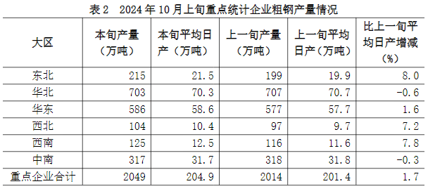 10月上旬六大地區(qū)中,除華北、中南地區(qū)重點(diǎn)統(tǒng)計(jì)企業(yè)粗鋼日產(chǎn)量較上一旬略有下降外,其它地區(qū)均有不同程度增長(zhǎng)(詳見表2),具體為: