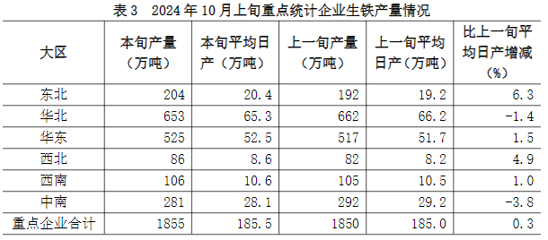 10月上旬六大地區(qū)中,除華北、中南地區(qū)重點(diǎn)統(tǒng)計(jì)企業(yè)生鐵日產(chǎn)量較上一旬下降外,其它地區(qū)均有不同程度增長(zhǎng)(詳見表3),具體為:
