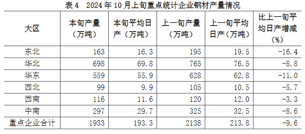 10月上旬,六大地區(qū)重點(diǎn)統(tǒng)計(jì)企業(yè)鋼材日產(chǎn)量較上一旬均有不同程度下降(詳見表4),具體為: