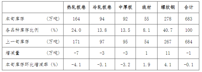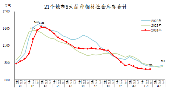 11月下旬,21個城市5大品種鋼材社會庫存683萬噸,環(huán)比減少1萬噸,下降0.1%,庫存變化不大;比10月下旬減少17萬噸,下降2.4%;比年初減少46萬噸,下降6.3%;比上年同期減少72萬噸,下降9.5%。