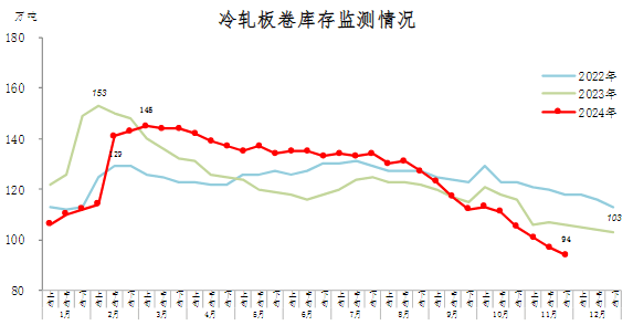11月下旬,冷軋板卷庫存94萬噸,環(huán)比減少3萬噸,下降3.1%,庫存繼續(xù)下降;比10月下旬減少11萬噸,下降10.5%;比年初減少9萬噸,下降8.7%;比上年同期減少12萬噸,下降11.3%。